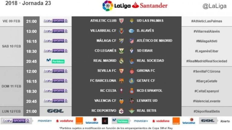 LaLiga ha dado a conocer los horarios de la 23ª jornada donde destacan: Málaga-Atlético (sábado 10 de febrero a las 16:15); Real Madrid-Real Sociedad (sábado 10 de febrero a las 20:45). El domingo el Barcelona recibirá al Getafe a las 16:15h y ese mismo día a las 20:45 habrá derbi entre Valencia y Levante.