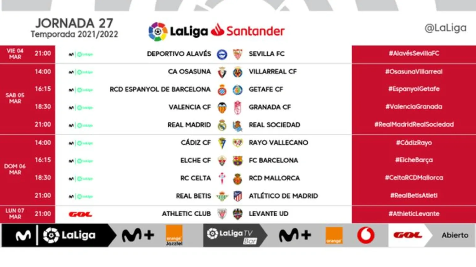 Jornada que se abre el viernes 4 de marzo con el partido Alavés-Sevilla, a las 21.00 horas y en la que el Real Madrid-Real Sociedad se jugará el sábado 5 de marzo a las 21.00 horas
