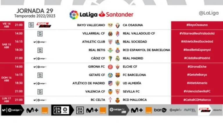 Jornada que comenzará el viernes 14 de abril con el Rayo-Osasuna y se acaba el lunes 17 con el Celta-Mallorca. Destacan el Cádiz-Madrid el sábado 14 y el domingo el Getafe-Barça.