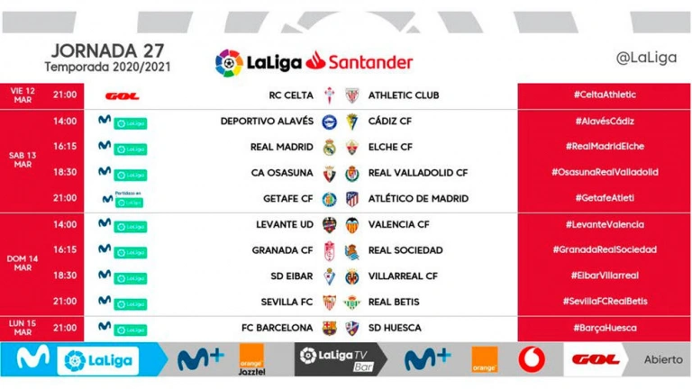 LaLiga ha dado a conocer este lunes, con un mes de antelación, los horarios previstos para la jornada 27 de LaLiga Santander, que se disputará entre el viernes 12 y el lunes 15 de marzo de 2021.