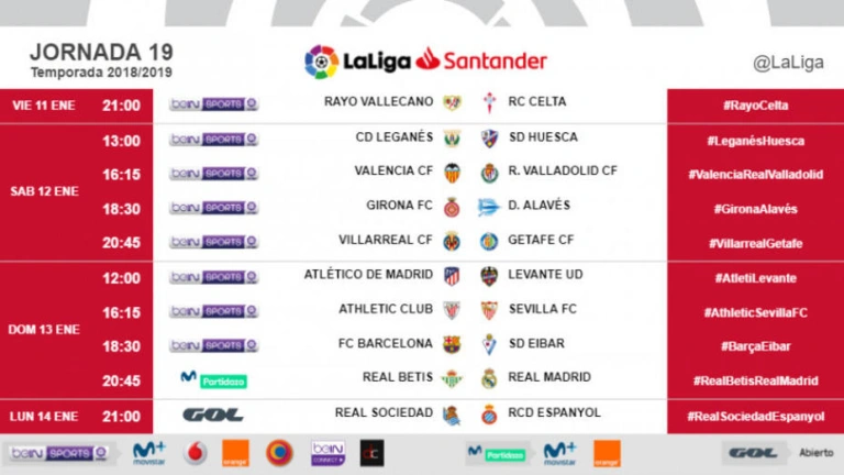 El Real Sociedad-Espanyol, cerrará el lunes 14 de enero a las 21:00 la primera vuelta de LaLiga. La 19ª jornada arrancará el viernes 11 con el Rayo-Celta.