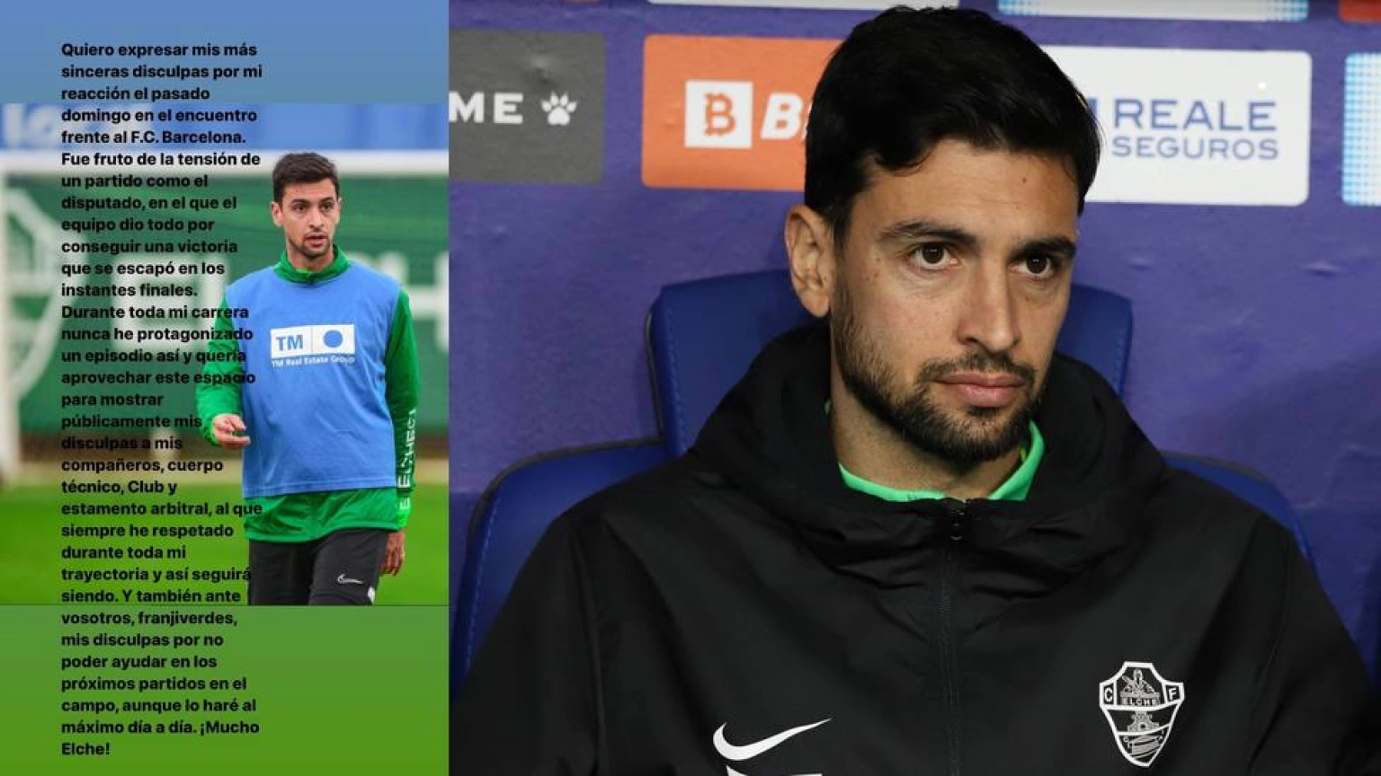 El jugador ha pedido disculpas por lo sucedido en su cuenta de Instagram: "Quiero expresar mis más sinceras disculpas por mi reacción el pasado domingo en el encuentro frenta al F.C. Barcelona. Fue fruto de la tensión de un partido como el disputado, en el que el equipo dio todo por conseguir una victoria que se escapó en los instantes finales. Durante toda mi carrera nunca he protagonizado un episodio así y quería aprovechar este espacio para mostrar públicamente mis disculpas a mis compañeros, cuerpo técnico, club y estamento arbitral, al que siempre he respetado durante toda mi trayectoria y así seguirá siendo. Y también ante vosotros, franjiverdes, mis disculpas por no poder ayudar en los próximos partidos en el campo, aunque lo haré al máximo día a día".
