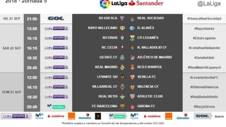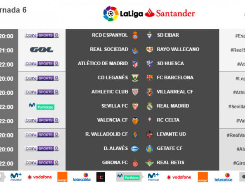 Previamente, unos días antes, entrará en escena la sexta jornada, que se disputará entre semana, y en la que destaca la visita al estadio Sánchez Pizjuán del Real Madrid. Será el miércoles 26 de septiembre, a la misma hora que el Valencia-Celta.