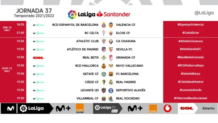 LaLiga ha anunciado este jueves en sus redes sociales el cambio de horario de 8 de los 10 partidos de la 37ª jornada, todos aquellos con algo en juego, y que se retrasarán una hora para pasar a disputarse a las 19:30 horas, en lugar de a las 18:30 como estaba previsto en un primer momento.