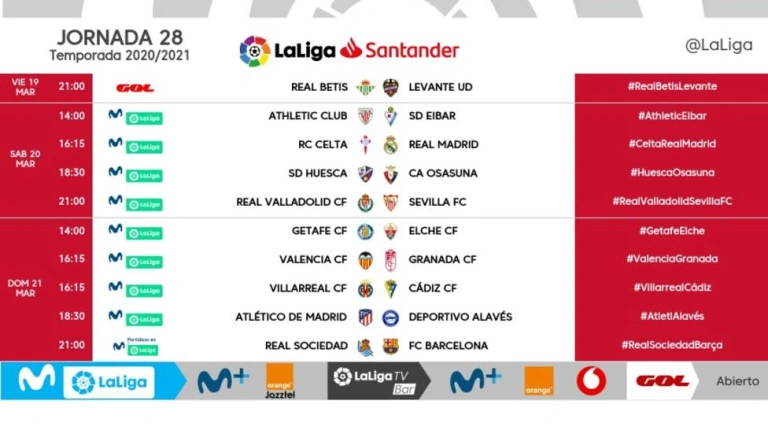 --HORARIOS DE LA JORNADA 28 DE LALIGA SANTANDER.