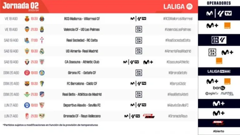 El partido de la segunda jornada de la LaLiga EA Sports Girona-Getafe, que se disputará el domingo 20 de agosto, pasa de las 17:30 a las 19:00 horas, debido a la previsión de altas temperaturas en la ciudad catalana.