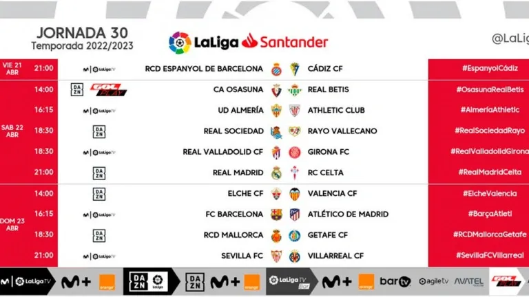 Conoce los horarios de la jornada 30 en LaLiga Santander, que se disputa entre el viernes, 21 y el domingo, 23 de abril.