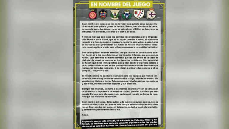 Siempre los mismos, siempre a las mismas deshoras y con la sensación de abandono o impotencia de nuestros clubes, que dan la callada por respuesta. Por eso, seis aficiones, seis, pedimos el respeto en forma de horarios que las aficiones se merecen.
