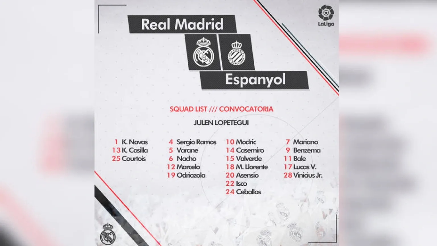 La lista de convocados del Real Madrid ante el Espanyol la conforman 20 futbolistas, entre ellos, Vinicius Jr.