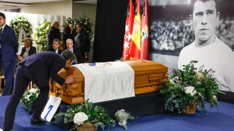 El ataúd cerrado con los restos mortales de 'El Brujo' estuvo acompañado de una camiseta con su dorsal '7', una gran foto como jugador, las banderas de España, de la Comunidad de Madrid y del Real Madrid con crespones negros y los 13 títulos -nueve Ligas, tres Copas del Rey y una Copa de Europa- que ganó con la camiseta blanca.