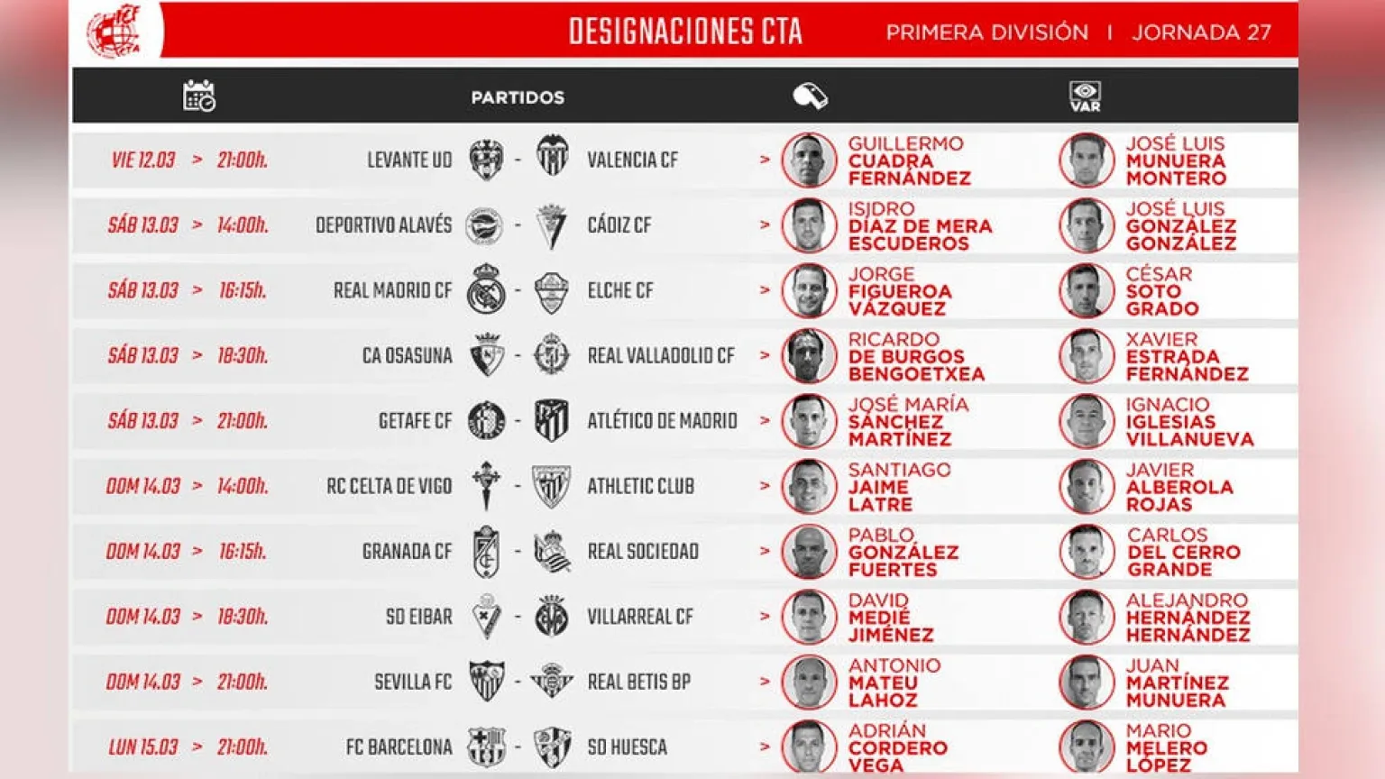 El Comité Técnico de Árbitros ha designado los siguientes arbitrajes para la jornada 27 de LaLiga Santander, que se celebra este fin de semana y en el que destacan los tres derbis: Levante - Valencia, el viernes 12; el Getafe - Atlético de Madrid del sábado 13 y el Sevilla - Betis del domingo 14 de marzo.