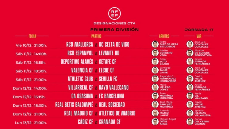 La Real Federación Española de fútbol ha anunciado este jueves las designaciones arbitrales para la jornada 17 de LaLiga, que se disputa este fin de semana.