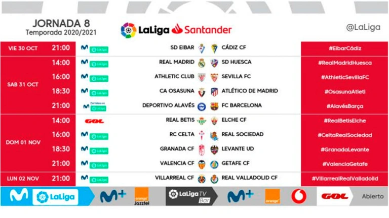 LaLiga ha dado a conocer este sábado los horarios de la 8ª jornada de LaLiga Santander, que se disputa entre el viernes 30 de octubre y el lunes 2 de noviembre.