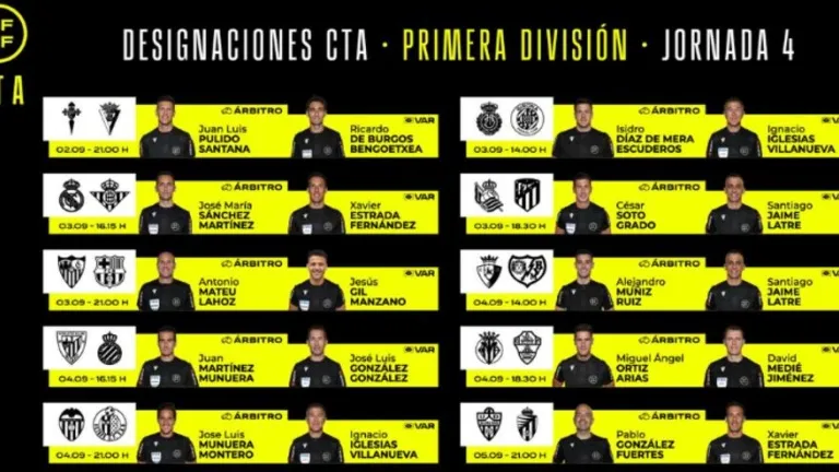 La Real Federación Española de Fútbol ha dado a conocer las designaciones arbitrales para la cuarta jornada de LaLiga Santander. Sánchez Martínez dirigirá el Real Madrid-Betis del próximo sábado a las 16.15 horas. Mientras que el colegiado murciano estará sobre el césped del Santiago Bernabéu, en el VAR estará Estrada Fernández. En el caso del Sevilla-Barcelona que cierra la jornada del sábado a las 21.00 horas, Mateu Lahoz será el árbitro designado para el partido del Sánchez Pizjuán. Al valenciano le acompañará González González en el VAR.