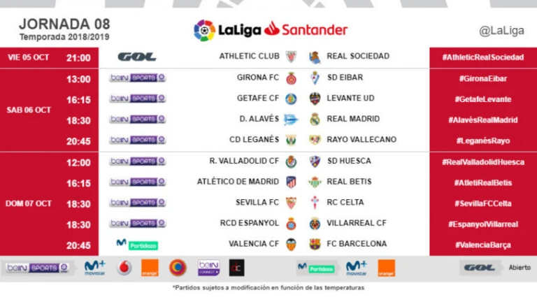 La octava jornada de LaLiga Santander se jugará entre el viernes 5 y el domingo 7 de octubre. El partido estrella el Valencia-Barcelona cerrará un fin de semana de fútbol que arrancará con el derbi vasco.