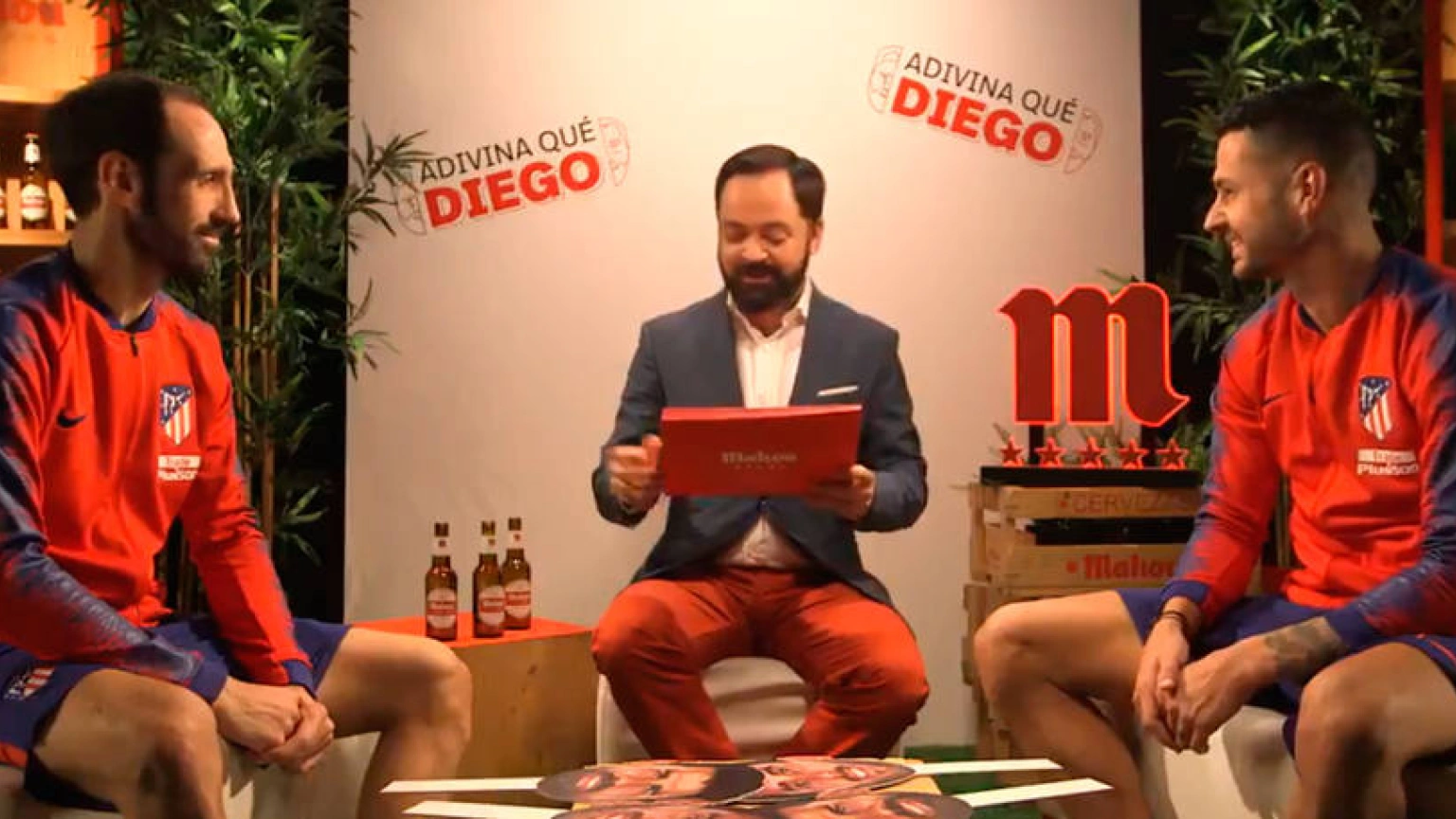 Juanfran participó con su compañero Víctor Machín 'Vitolo' en un curioso concurso organizado por Mahou, uno de los patrocinadores del Atlético, en el que debían acertar en cada pregunta si el dato se refería a Diego Costa o a Diego Godín.
