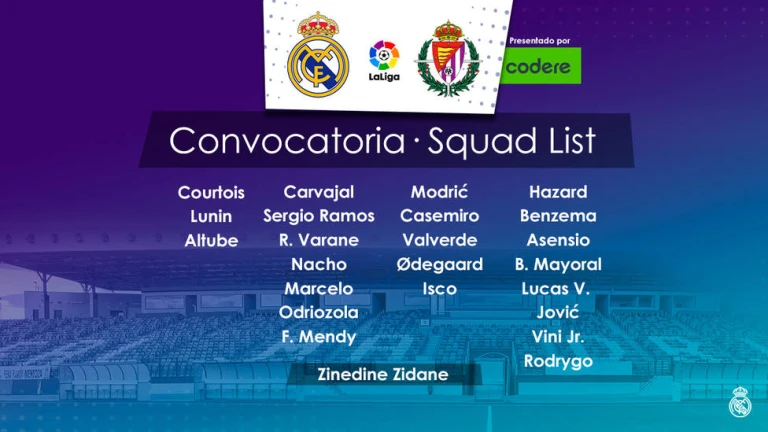 La lista de convocados la integran: Courtois, Lunin, Diego Altube, Carvajal, Odriozola, Varane, Sergio Ramos, Nacho, Marcelo, Mendy, Casemiro, Fede Valverde, Modric, Martin Odegaard, Hazard, Isco, Lucas Vázquez, Marco Asensio, Vinicius, Rodrygo, Benzema, Borja Mayoral y Jovic