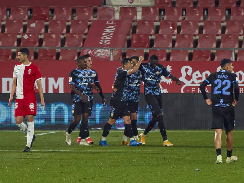 El Almería celebró este domingo un sufrido triunfo de prestigio en Girona (0-1) que le sirvió para avanzar al Espanyol y situarse segundo, en posiciones de ascenso directo por primera vez desde la 15ª jornada y con un punto más que los blanquiazules y a cinco del Mallorca, líder. Umar Sadiq marcó el gol de los visitantes, que enlazaron el segundo triunfo y rompieron una racha de tres meses sin sumar los tres puntos como visitantes.
