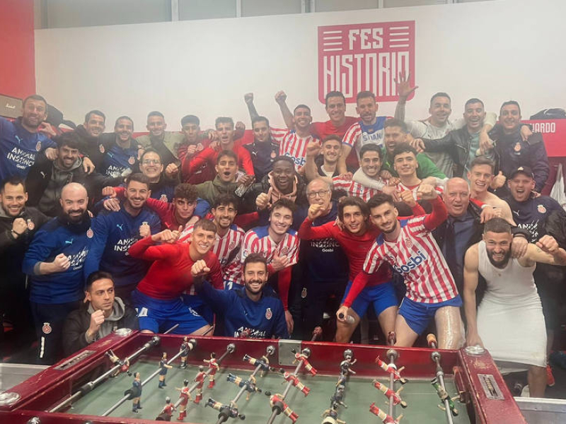Los jugadores del Girona celebran su victoria ante el Málaga en el vestuario de Montilivi | @GironaFC