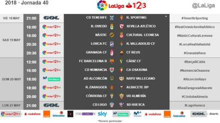 La jornada dará comienzo el viernes 18 de mayo a las 21:00 horas con el Tenerife - Sporting y concluirá el lunes 21 a las 21:00 horas con el partido Lugo - Huesca. Además, el líder Rayo visitará Alcorcón el domingo 20 a partir de las 18h.