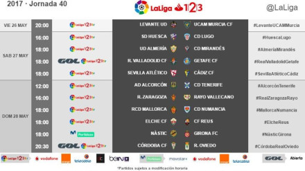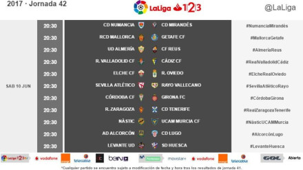 Resultados: Lugo, 1 - Levante, 0; Cádiz, 2 - Elche, 1; Getafe, 4 - Almería, 0; Girona, 0 - Zaragoza, 0; Huesca, 0 - Numancia, 0; Mirandés, 2 - Mallorca, 2; Rayo, 1 - Córdoba, 2; Oviedo, 1 - Sevilla Atl, 0; Reus, 2 - Valladolid, 0; Tenerife, 0 - Nástic, 1.