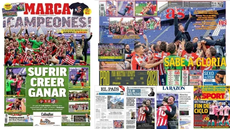 'Campeón del Sufrimiento' es el titular escogido por 'El Mundo' que da la parte derecha de su portada a los rojiblancos. Se puede ver al Cholo fundido en los brazos de Correa bajo el epígrafe: "El Atlético remonta en Valladolid y conquista su Liga número 11. Miles de aficionados desoyen las recomendaciones y lo celebran en la fuente de Neptuno".