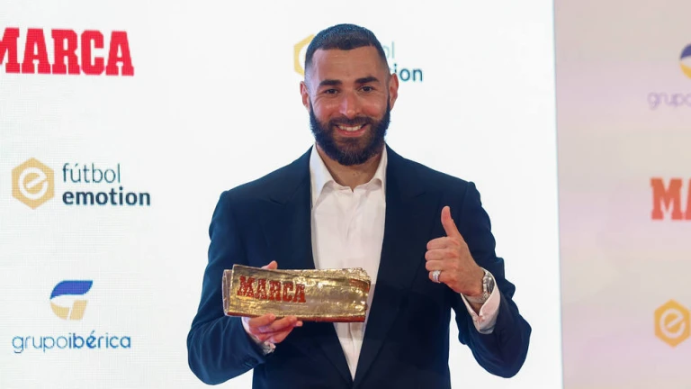 El delantero francés del Real Madrid, Karim Benzema, recibe el trofeo MARCA Leyenda