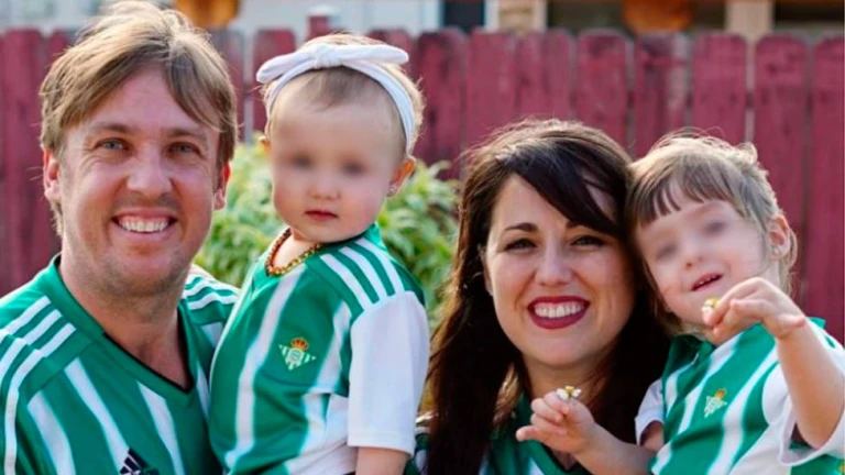 Juanma Linares, junto a su mujer y sus dos hijas, con la camiseta del Betis