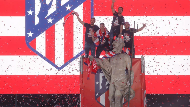 La plantilla del Atlético de Madrid se subió a la fuente de Neptuno en 2018. CORDONPRESS