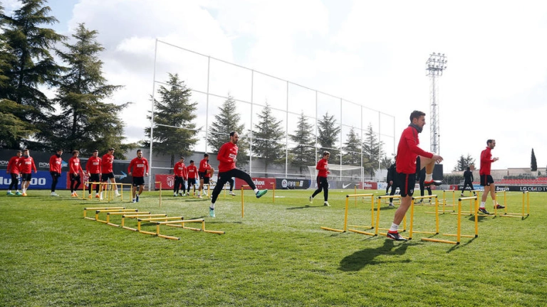 El resto de futbolistas rojiblancos, incluidos los canteranos Roberto Olabe, Antonio Montoro y Ricard Sánchez, trabajaron la estrategia de cara al duelo de ida de los cuartos de final contra el Sporting de Portugal, el jueves en el estadio Wanda Metropolitano.