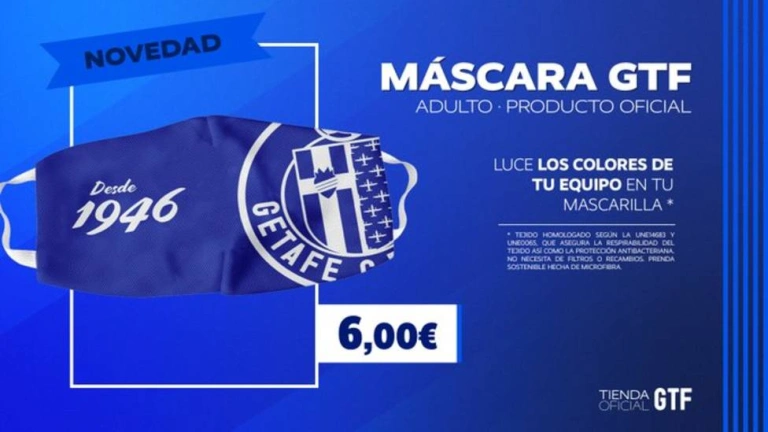 A la venta en la tienda oficial del club. Las mascarillas, según informa el Getafe, son de varios usos y se encuentran totalmente homologadas. El color es el tradicional azul del equipo.