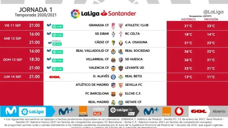 LaLiga ha dado a conocer los horarios de la 1ª y la 2ª jornada de LaLiga Santander 2021/20. La primera comenzará el viernes 11 de septiembre a las 21:00 con el duelo entre Granada CF y Athletic Club en el estadio Los Cármenes, y terminará el lunes 14 de septiembre a las 21:00 horas con el partido el Alavés y el Betis en Mendizorroza.