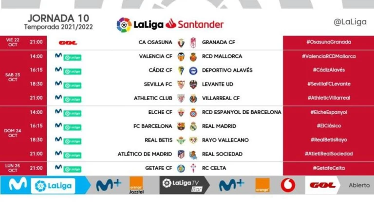LaLiga ha dado a conocer los horarios de la 10ª jornada de LaLiga Santander 2021/22. Esta jornada comenzará el viernes 22 de octubre a las 21:00 con el duelo entre el Osasuna y el Granada y terminará el lunes 25 de octubre a las 21:00 horas con el partido entre el Getafe y el Celta.