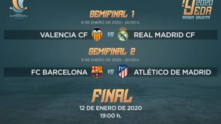 El Valencia-Real Madrid y el Barcelona-Atlético se jugarán el miércoles 8 de enero y el jueves 9 a las 20:00. La final será el domingo 12 a las 19:00.