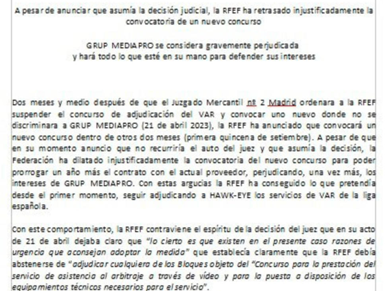 "Con estas argucias la RFEF ha conseguido lo que pretendía desde el primer momento, seguir adjudicando a Hawkeye los servicios de VAR de la liga española. Con este comportamiento, la RFEF contraviene el espíritu de la decisión del juez que en su auto de 21 de abril dejaba claro que 'lo cierto es que existen en el presente caso razones de urgencia que aconsejan adoptar la medida' que establecía que la RFEF debía abstenerse de "adjudicar cualquiera de los Bloques objeto del Concurso para la prestación del servicio de asistencia al arbitraje a través de vídeo y para la puesta a disposición de los equipamientos técnicos necesarios para el servicio".