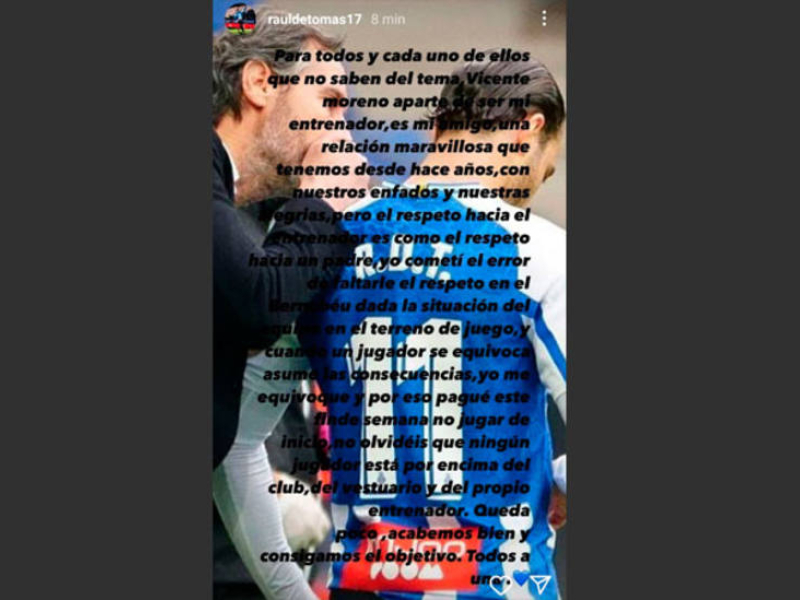 El delantero del Espanyol, que fue suplente en el partido del fin de semana contra Osasuna, reconoció en su Instagram que tuvo un problema con su entrenador.