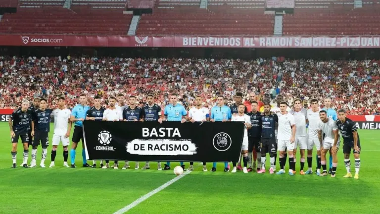 Jugadores del Sevilla y del Independiente posando con una pancarta contra el racismo