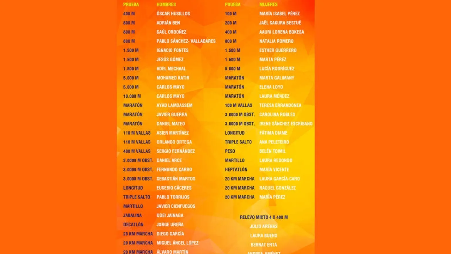Están en la lista definitiva 17 plusmarquistas nacionales: Saúl Ordóñez en 800 m (1:43.65), Mohamed Katir en 5.000m (12:50.79), Ayad Lamdassem en maratón (2:06.35), Orlando Ortega en 110 m vallas (13.04), Sergio Fernández en 400 m vallas (48.87), Fernando Carro en 3.000 m obstáculos (8:05.69), Ana Peleteiro en triple salto (14.73 i), Pablo Torrijos en triple salto (17.18 i), Belén Toimil en peso (18.80), Laura Redondo en martillo (70.66), Javier Cienfuegos en martillo (79.38), Odei Jainaga en jabalina (84.80), María Vicente en heptatlón (6.304), Aauri Lorena Bokesa, Bernat Erta, Andrea Jiménez, Julio Arenas en el relevo 4 x 400 m mixto (3:18.98) y María Pérez en 20 km marcha.
