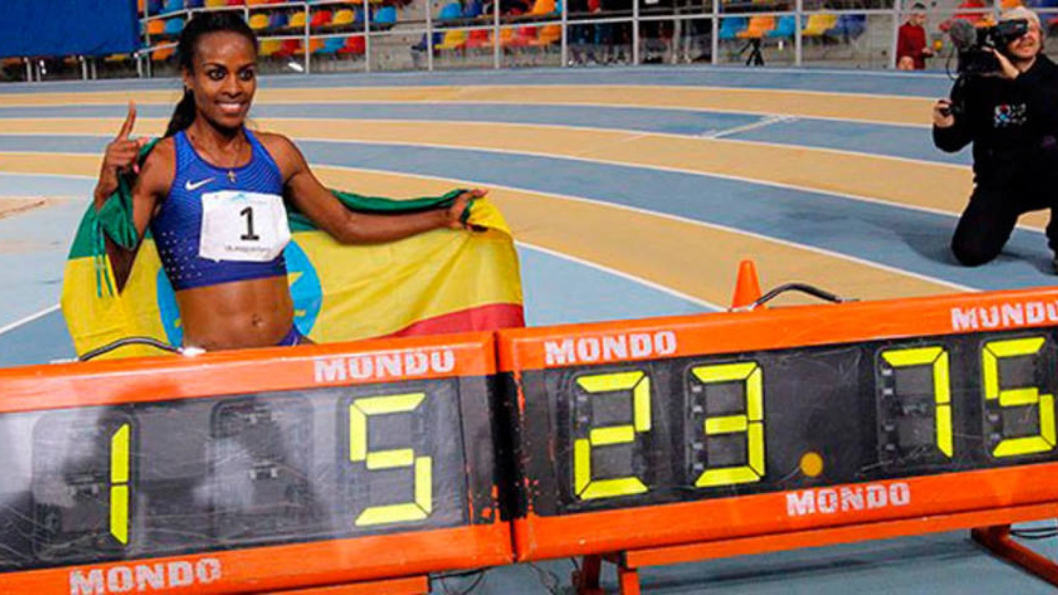 La etíope Dibaba posa con su registro que supone el nuevo récord mundial de los 2.000 metros. @atletismoRFEA