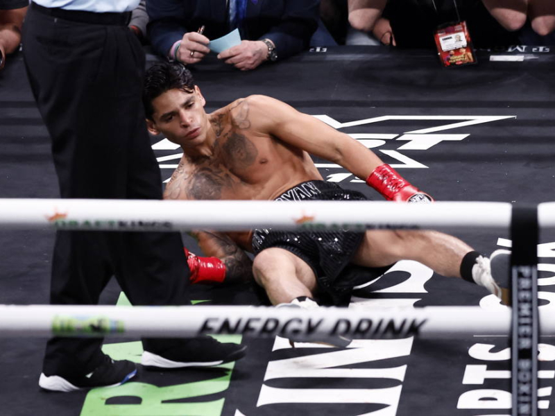 Ryan García, en la lona durante el segundo asalto del combate.