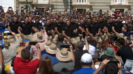 Los Classic All Blacks, el equipo de leyendas de rugby de Nueva Zelanda, han sido recibidos este lunes por el alcalde de Madrid, José Luis Martínez-Almeida, y la vicealcaldesa, Begoña Villacís, en la Plaza de Oriente, donde han ejecutado su tradicional 'haka' (danza maorí).