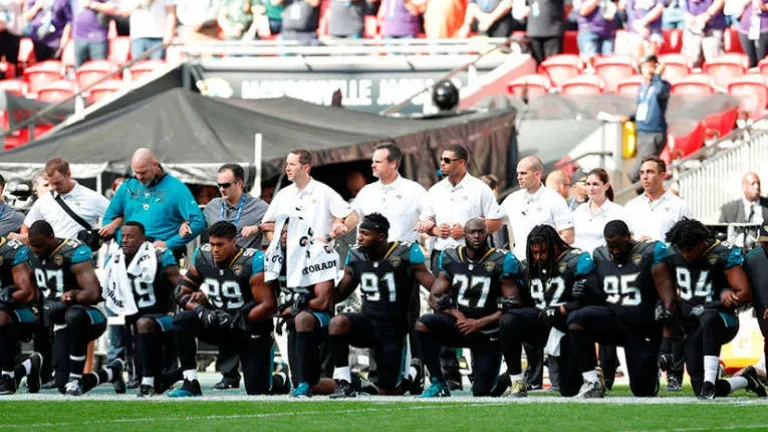Numerosos jugadores mostraron su rechazo arrodillándose o cruzando sus brazos durante la entonación del himno nacional antes de los partidos de fútbol americano, una solemne tradición que se lleva a cabo en todos los actos deportivos del país.