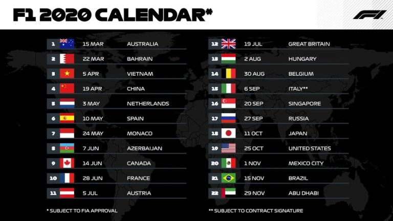 El calendario previsto para celebrar en 2020 el septuagésimo aniversario de la Fórmula Uno arranca el 15 de marzo en Australia y finaliza, como viene siendo habitual, en Abu Dabi el 29 de noviembre.