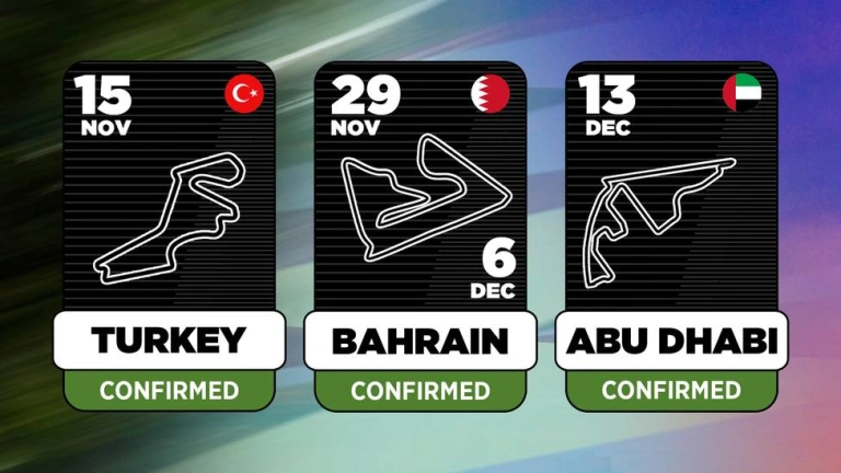El Gran Premio de Turquía se disputará en Estambul, del 13 al 15 de noviembre. Baréin acogerá dos pruebas, del 27 al 29 de noviembre y del 4 al 6 de diciembre. Por su parte, el circuito de Yas Marina albergará el Gran Premio de Abu Dabi del 11 al 13 de diciembre.