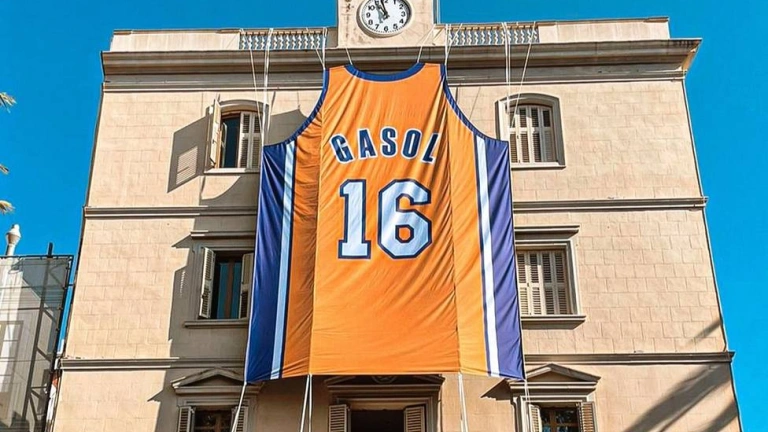 La NBA ha desplegado una camiseta gigante de Pau Gasol con Los Angeles Lakers con el dorsal '16' que la franquicia angelina retirará en el duelo ante Memphis Grizzlies --otro exequipo del exjugador-- del 7 de marzo, en una prefiesta y homenaje a un Pau Gasol que es hijo predilecto de la localidad.