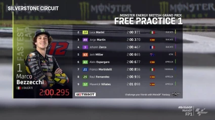 El italiano Marco Bezzecchi (Ducati Desmosedici GP22) encabezó el dominio de la "Armada Ducati" en la primera tanda de entrenamientos libres para el Gran Premio de Gran Bretaña de MotoGP, en el circuito de Silverstone. Bezzecchi doblegó por 36 milésimas de segundo a su compañero de equipo y compatriota Luca Marini (Ducati Desmosedici GP22), con el español Jorge Martín (Ducati Desmosedici GP23), tercero.