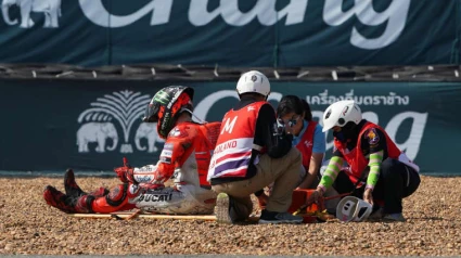 Lorenzo (Ducati Desmosedici GP18), renqueante sobre su moto por la lesión que se produjo en Aragón, pasó por el calvario que nadie desea tras una situación así y se volvió a caer. Salió despedido de su moto, por los aires, en la curva tres del trazado tailandés, pero con idéntico resultado al de Motorland Alcañiz, pues tuvo que ser evacuado a la clínica del circuito en ambulancia.