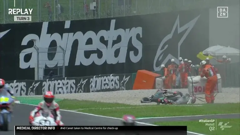 El ritmo, vuelta tras vuelta, aprovechando el fallo de las predicciones atmosféricas que daban lluvia todo el sábado, fue en aumento en la segunda parte de la clasificación, tras un primer paso por los talleres. Con Aron Canet como líder, el de Corbera se volvió a ir por los suelos, por tercera vez en este fin de semana, en la curva tres, quedando postrado en el suelo durante algunos instantes y agarrándose una de sus manos para acabar en la clínica del circuito.