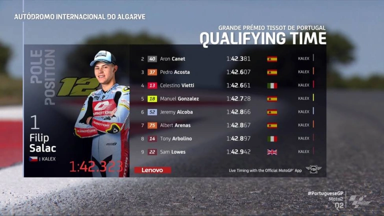 El checo Filip Salac (Kalex) firmó la segunda pole de su carrera deportiva y la primera en Moto2, al conseguir la primera plaza para el Gran Premio de Portugal que se disputa este domingo en el circuito de Portimao. Salac paró el crono en 1:42.323, con el que aventajó en 68 milésimas de segundo al español Arón Canet (Kalex) quien por la mañana había sido el más rápido y había establecido un nuevo récord de 1:42.003.