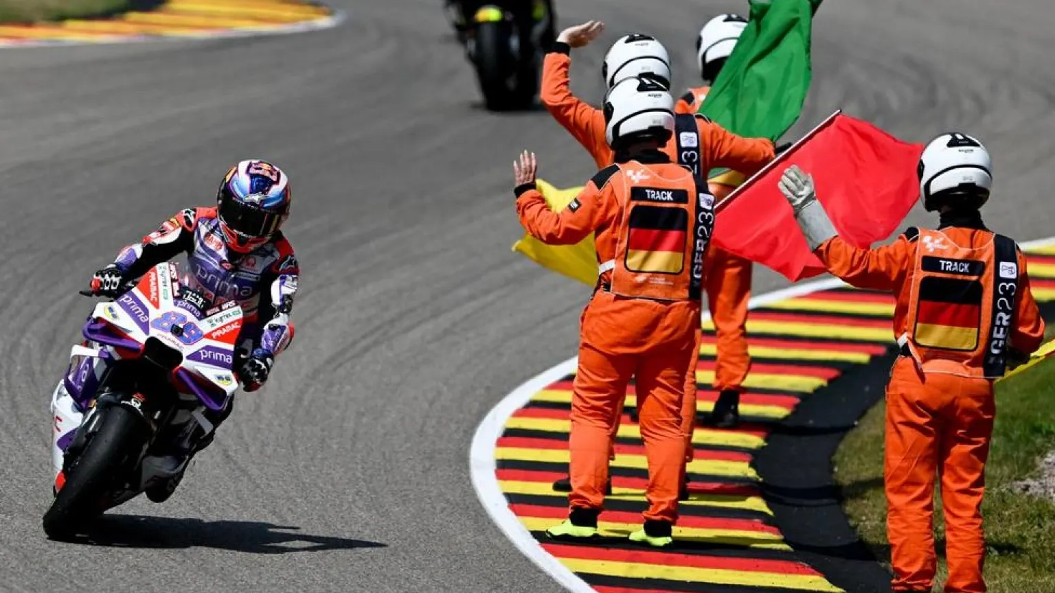 El español Jorge Martín (Ducati Desmosedici GP23) venció por escasamente 64 milésimas de segundo al campeón del mundo, el italiano Francesco "Pecco" Bagnaia (Ducati Desmosedici GP23), el Gran Premio de Alemania de MotoGP disputado este domingo en el circuito de Sachsenring.